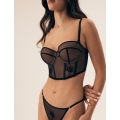 Komplekts "Posse" ir jutekliskas provokācijas kvintesence mežģīnēs. Atvērtā kausiņa krūšturis ar stī..