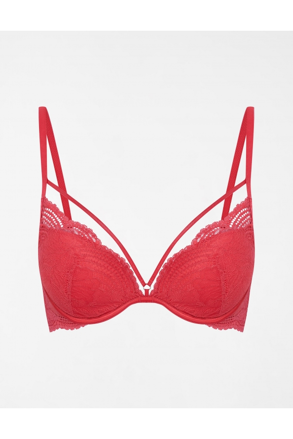 Push-up bra that spectacularly grips and lifts the breasts. The triangle cups and the wings are made of fashionable lace with a floral motif. A timeless model that catches the eye with its interesting details. The neckline is decorated with ties that run from the narrow bridge to the straps. On the back, two subtle triangular cutouts on the hem frame catch the eye. Available in two color variants. • Ideal for V-neck dresses, tops and shirts • Non-detachable, adjustable straps • Waist finished with scalloped lace • Three-tier hook and eye closure