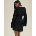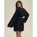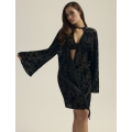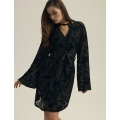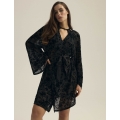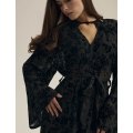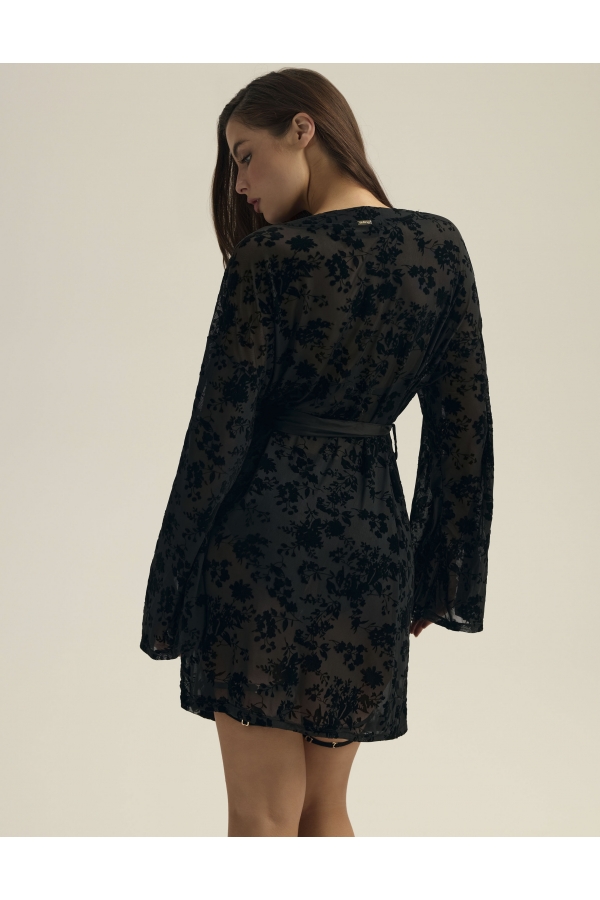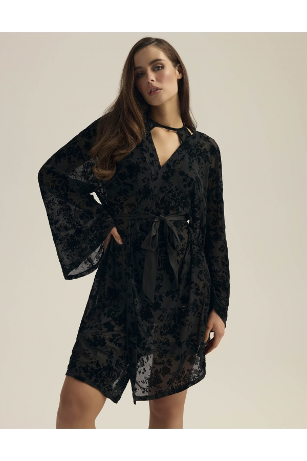 Halāts "Zequine" ir jutekliskas elegances kvintesence, kas radīts sievietēm, kuras vēlas ietīt savu ķermeni maigumā un pavedinošā šarmā. Caurspīdīgais audums, kas rotāts ar samtainu ziedu rakstu, maigi krīt pāri siluetam, nemanāmi uzsverot tā līknes. Platas, plūstošas piedurknes piešķir viegluma un teatralitātes pieskārienu, savukārt satīna lente, kas sasienama jostasvietā, nodrošina regulējamu pārklājumu. Šis unikālais aksesuārs piešķirs noslēpumainības un greznības pieskārienu jebkuram intīmam brīdim. Materiāla sastāvs: 95% poliesters, 5% elastāns.