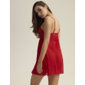 Risky kleitas dizains, kas valdzina ar savu jutekliskumu un neatstāj vienaldzīgu nevienu. Elegantas mežģīnes apņem krūtis, uzsverot to līknes, savukārt caurspīdīgais audums maigi krīt, pavedinoši atklājot augumu. Dziļš šķēlums priekšpusē padara katru mirkli valdzinošu, un piesātināti sarkanā krāsa vēl vairāk pastiprina tās drosmīgo un kaislīgo pievilcību. Risky ir izvēle sievietēm, kurām patīk uzsvērt savu sievišķību un apzināti spēlēties ar savām emocijām. Materiāla sastāvs: Mežģīnes: 90% poliamīds, 10% elastāns. Tīklveida audums: 90% poliamīds, 10% elastāns.