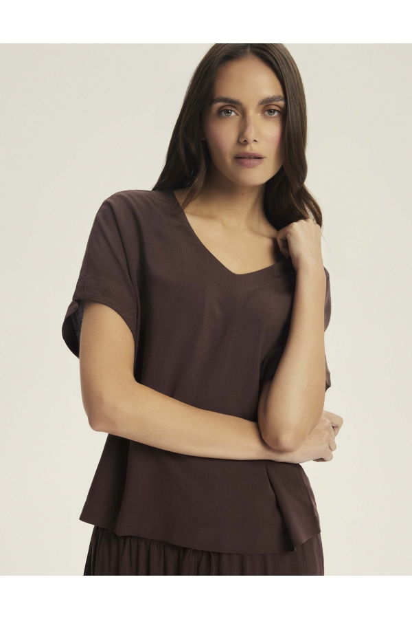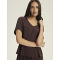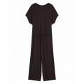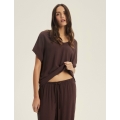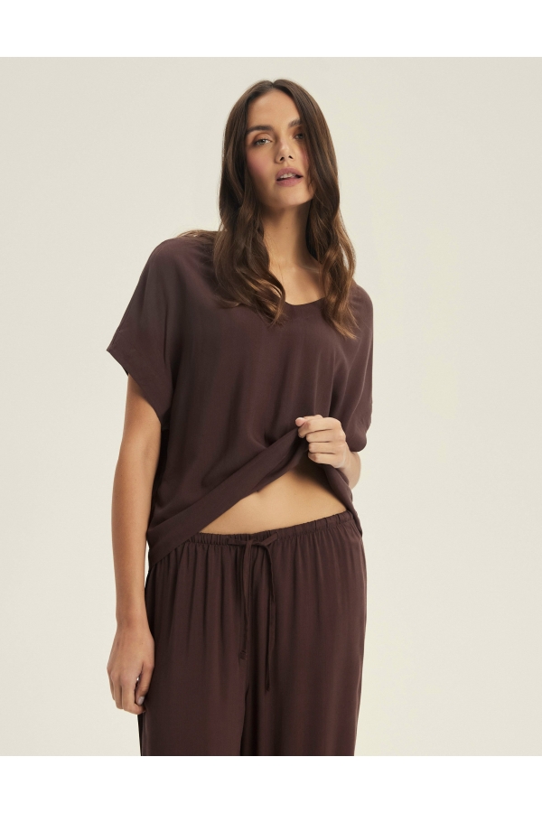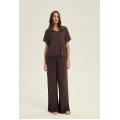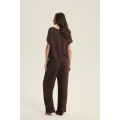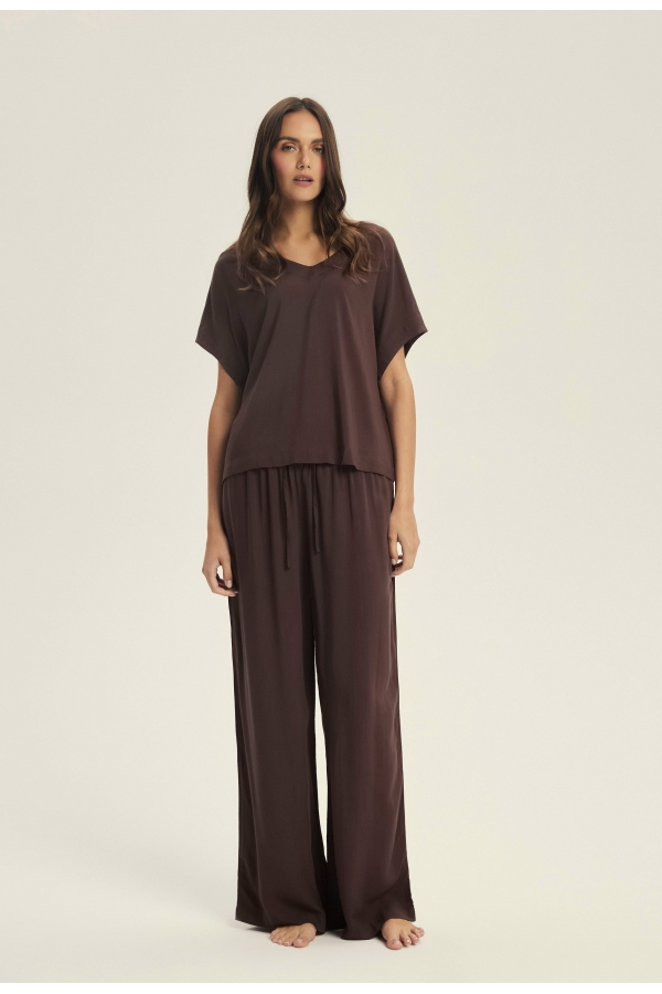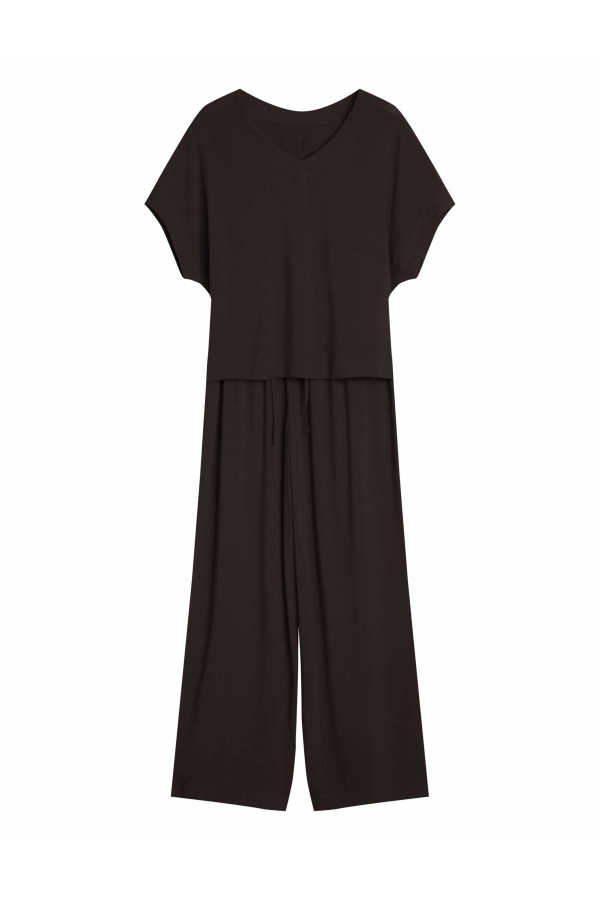 Tumši šokolādes tonis piešķir Corenso pidžamai jutekliskas vienkāršības auru. Smalka viskoze maigi pārklāj siluetu, radot plūstošas kustības un viegluma sajūtu. V veida kakla izgriezums un īsās piedurknes izceļ sievišķīgos plecus, savukārt garās, platās bikšu staras piešķir siluetam viegluma pieskārienu. Šis stils apvieno komfortu ar izsmalcinātību — ideāli piemērots gan miegam, gan nesteidzīgiem rītiem ar kafiju rokā. Dabīgs audums — 100% viskoze pilnīgam komfortam V veida kakla izgriezuma T-krekls ar īsām piedurknēm brīvā piegriezumā Garas, platas bikses ar aukliņu jostasvietā Materiāla sastāvs: 100% viskoze
