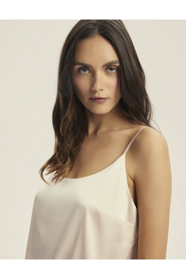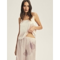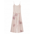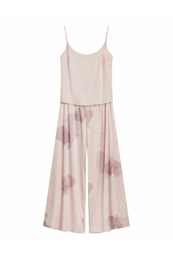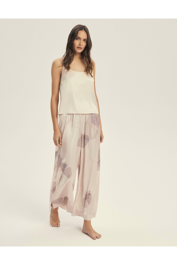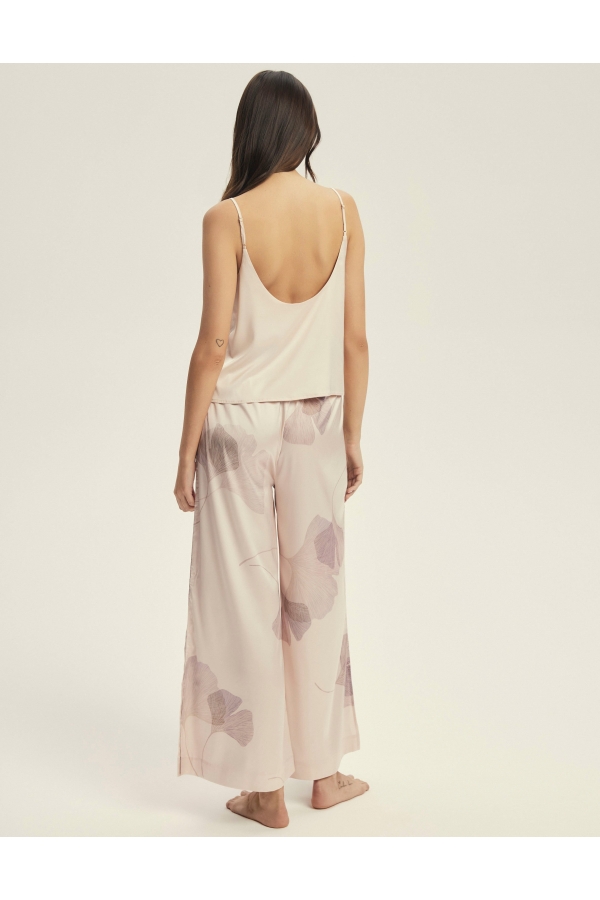 Vakari maiguma un rīta miera ritmā – Capriccio pidžama apņem ķermeni kā satīna čuksts. Tās smalkās krāsas saplūst ar ādu, un smalkais lapu apdruka rada kompozīciju, kas atgādina akvareļa sapni. Vienkāršs tops ar plānām lencītēm izceļ plecus un dekoltē, savukārt platas, plūstošas bikses ar augstu jostasvietu nodrošina komfortu, neupurējot jutekliskumu. Šis komplekts ir harmonisks elegances un komforta sajaukums – radīts, lai jūs justos skaisti katrā dzīves mirklī. Mīksts kakla izgriezums un plānas, regulējamas lencītes Platas bikses ar elastīgu jostasvietu Pasteļtoņos, spilgti rozā tonī